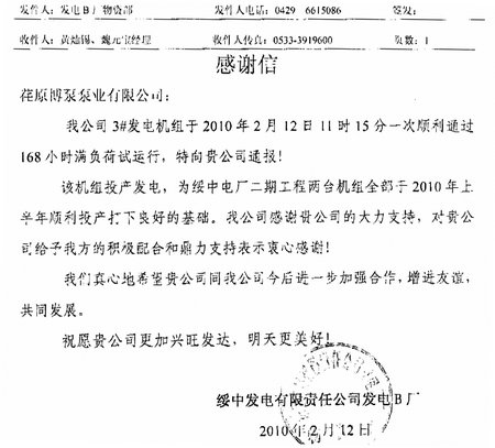 日前,綏中發(fā)電有限責(zé)任公司發(fā)電B廠發(fā)來(lái)感謝信,通報(bào)了我公司供貨的2000VZNM型立式循環(huán)水泵順利通過168小時(shí)滿負(fù)荷試運(yùn)行, 順利發(fā)電。綏中發(fā)電有限責(zé)任公司發(fā)電B廠,為2X1000MW超